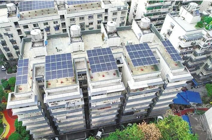 新华小区中的三栋楼,楼顶架设了光伏板。小区还引进了爱回收资源回收箱,闲置物品放进去就可兑换积分,很受老年人欢迎,低碳生活就在身边了。