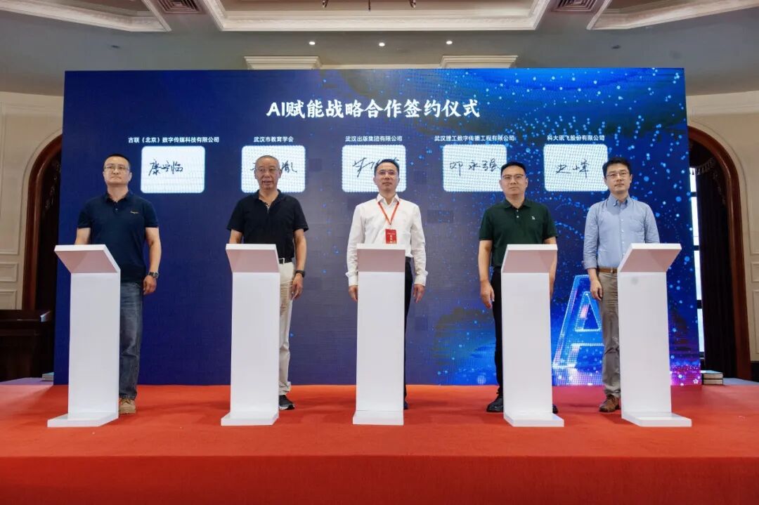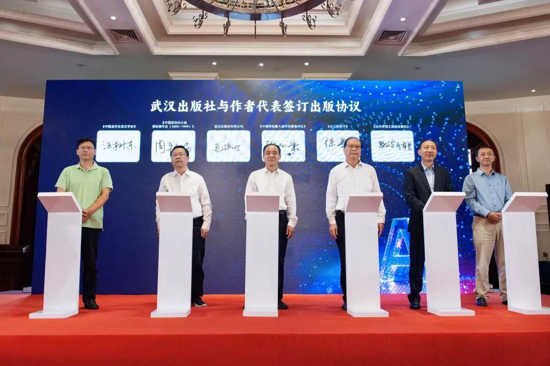 会议现场,武汉出版集团与科大讯飞、理工数传、中华古联、武汉教育学会签订AI赋能战略合作协议。武汉出版社与欧阳康、周新民、汪树东、何卓恩、徐鲁等多位专家学者和作家代表签订出版协议。武汉市新华书店与武汉经开区、东西湖区、汉阳区、黄陂区签订实体书店共建协议。