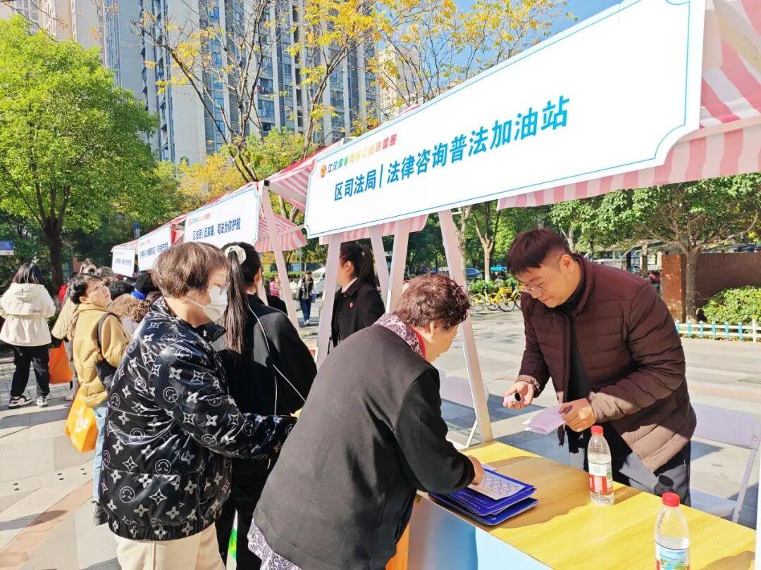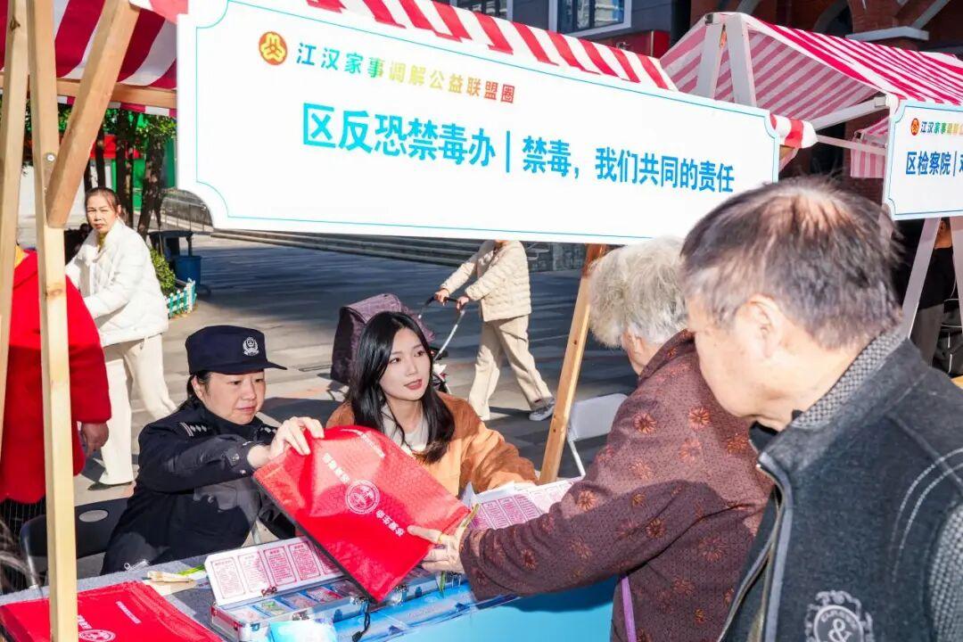 场外社区中心广场的普法宣传同样精彩纷呈。活动现场设置了10个咨询台及法律互动环节区,实现维权咨询、健康服务、普法教育、禁毒宣传全覆盖。其中,法律咨询台由法官、检察官、公安干警、司法行政工作人员坐阵,为居民提供专业的法律指导;心理咨询台由武汉市妇联“江城幸福家”、江汉区“姐妹连心桥”项目心理专家值守,提供情绪疏导、心理支持服务;“莲姐”普法台、禁毒普法展示台、妇幼健康关爱义诊宣传台有序排布,全方位满足居民多样化需求。
