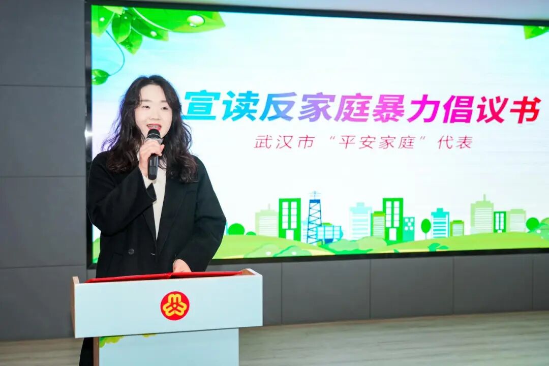 活动采用“内场深耕普法+场外广泛宣传”的模式,兼顾专业性与趣味性,旨在让反家暴理念深入人心。内场主题活动中,武汉市“平安家庭”代表率先宣读反家庭暴力倡议书,以铿锵有力的倡议发出抵制家暴、守护家庭的号召,传递守护美好生活的正向力量。