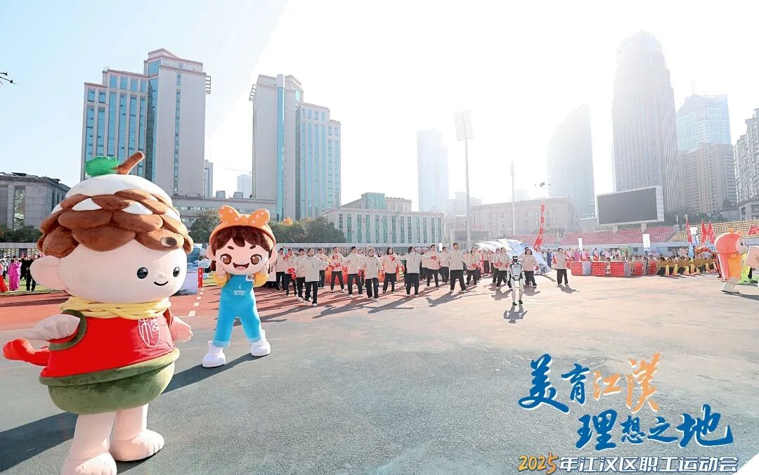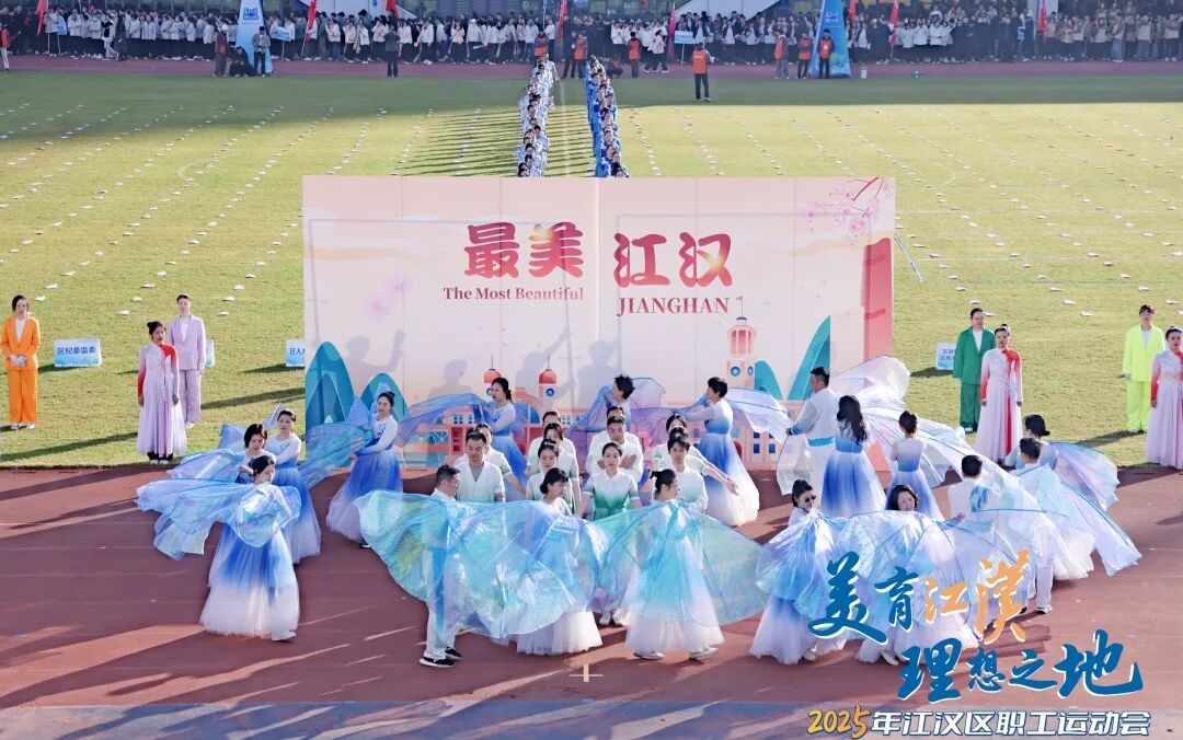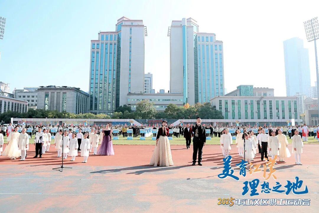 文艺演出环节同样精彩纷呈。开场舞《美丽中国》以热情舞步礼赞祖国;体育舞蹈《跃动未来》上演力量与美的碰撞;《活力江汉》歌曲串烧中,小歌手彭彦凯与武汉天使童声合唱团带来动人演唱,职工歌手联袂献唱《江汉四季》《相亲相爱》,引发全场共鸣;千人工间操展演气势恢宏,全场配合呈现“I♡JH”巨型画面,将开幕式推向高潮。