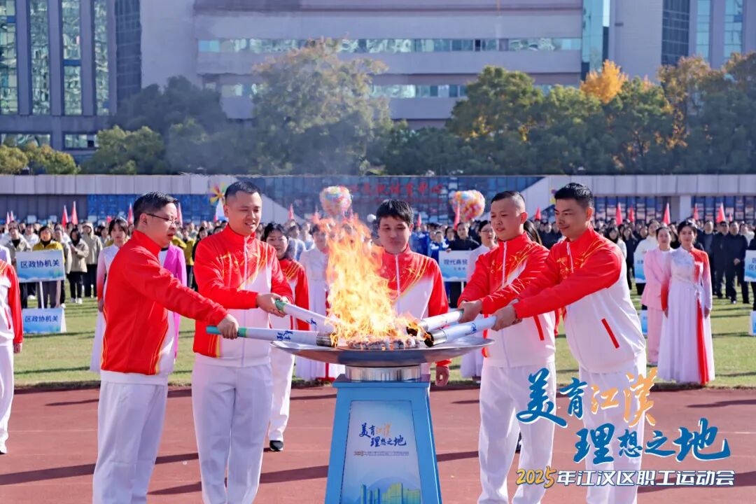 现场,“新兴之火”“数智之火”“金融之火”“枢纽之火”“人文之火”五棒火炬依次点亮,张裕、付俊、邵青、张宝剑、孟广松等15位劳模代表接力传递。燃烧的火焰,照耀着江汉区在科技创新、数字化转型、金融强区、商贸物流、文商体旅融合等发展领域坚定向前。当所有火炬手共同点燃主圣火盆,彩球腾空,全场沸腾,运动会正式开幕。