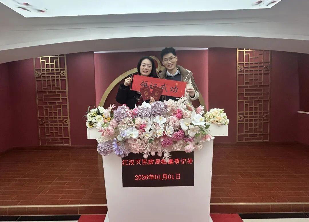 新人们表示选择在元旦当日登记结婚,既是对个人爱情承诺的浪漫见证,也赋予了新年伊始以特殊而美好的家庭意义。江汉区民政局婚姻登记处全体工作人员将以热情、细致、高效的服务,迎接每一对前来办理登记的新人,努力让红绸与誓言相映,让喜悦与效率并存,陪伴大家共同开启幸福新篇章。