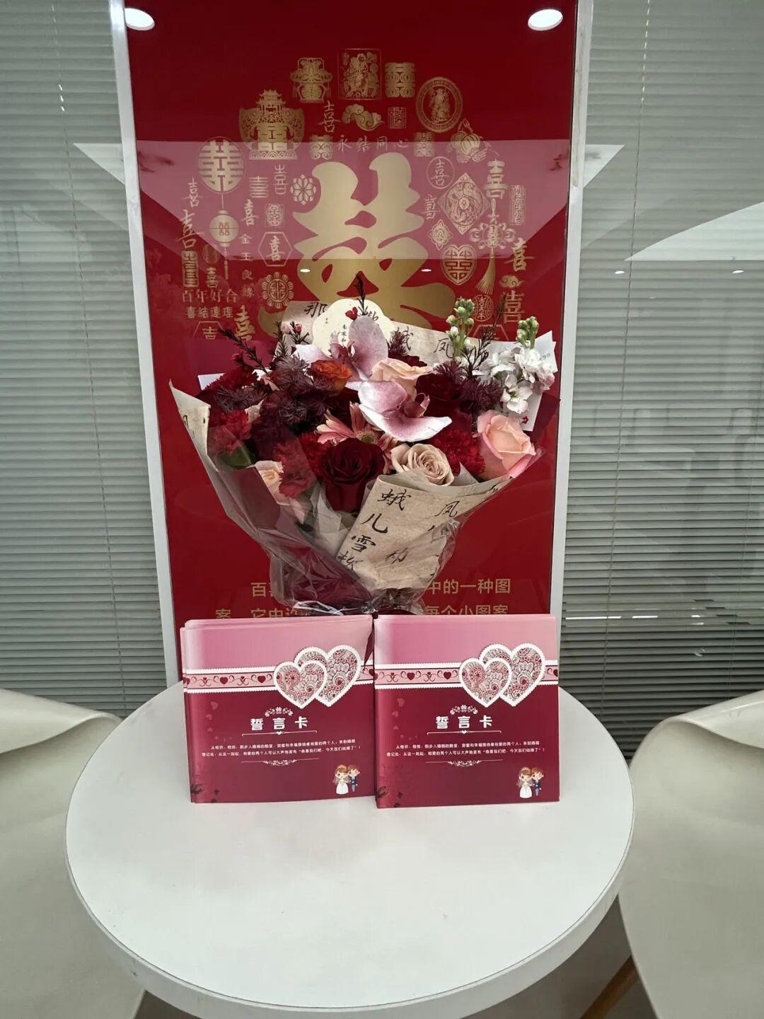 为增添登记仪式感与幸福感,婚姻登记处精心配备手捧花、头纱等道具,为领证新人提供免费拍照服务,让新人在温馨氛围中定格甜蜜时刻。在登记大厅设置“幸福打卡角”,方便新人拍照留念,以细节服务传递节日祝福与政务温度,让婚姻登记不仅有“速度”更有“温度”。并为新人免费发放《誓言卡》,赠送纪念小礼品,引导新人树立文明、健康的婚姻家庭观念,以促进家庭和谐稳定、提升家庭成员幸福感为核心,为新人提供一对一婚恋指导、家庭关系调适建议,将婚前教育与登记服务无缝衔接,让便民服务既有“温度”又有“深度”。帮助新人提前掌握夫妻相处、家庭矛盾化解的技巧,减少婚后摩擦,从源头降低婚姻纠纷发生率,维护社会和谐稳定。