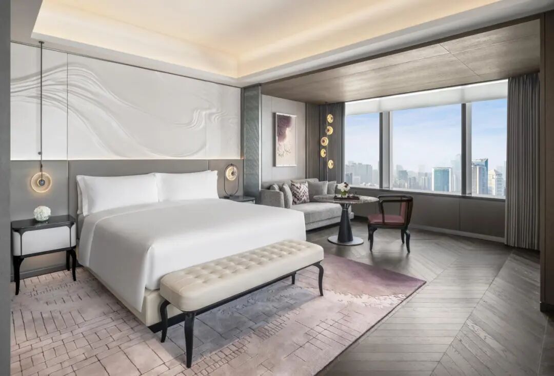 据悉,酒店设计由伦敦设计事务所KCAInternational与深圳郑中设计事务所CCD联袂打造,以“流光楚韵”为灵感,将武汉江河交汇的城市气韵与楚地文化底蕴转化为当代空间叙事。流畅的线条、层叠的材质与柔和的光影变幻,灵动地勾勒出水的流动意象,同时呈现楚文化的含蓄典雅,打造“鸿鹄东来”云端艺旅体验。