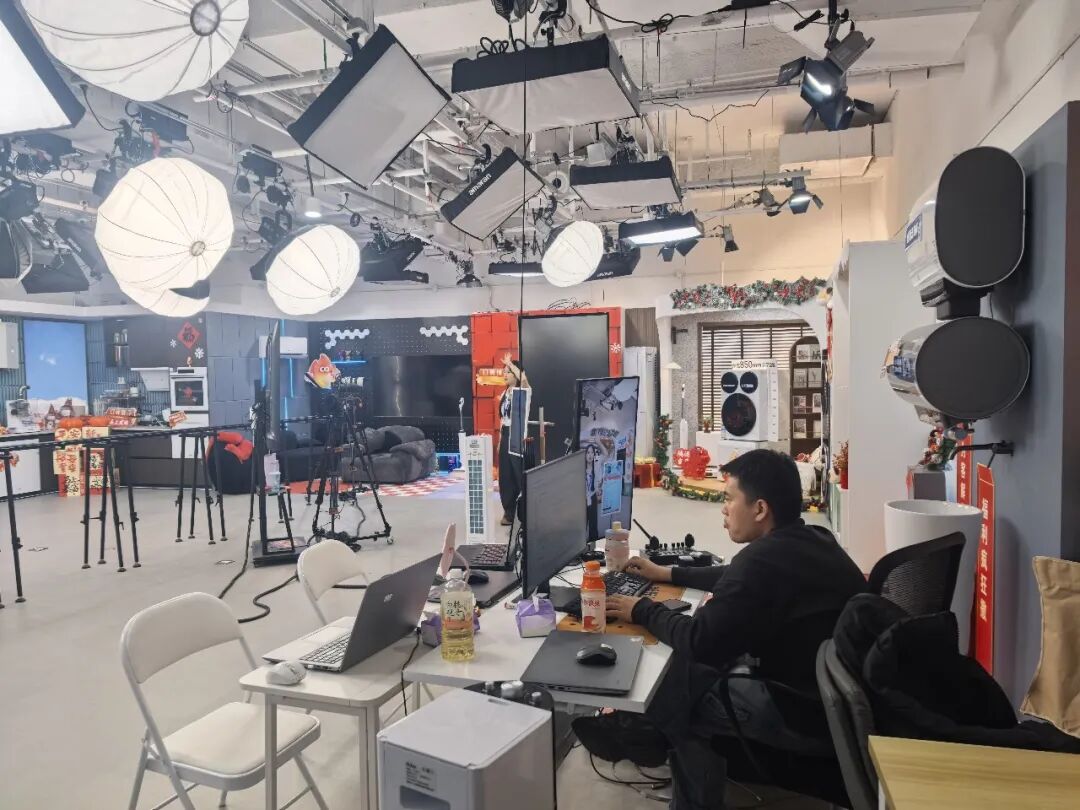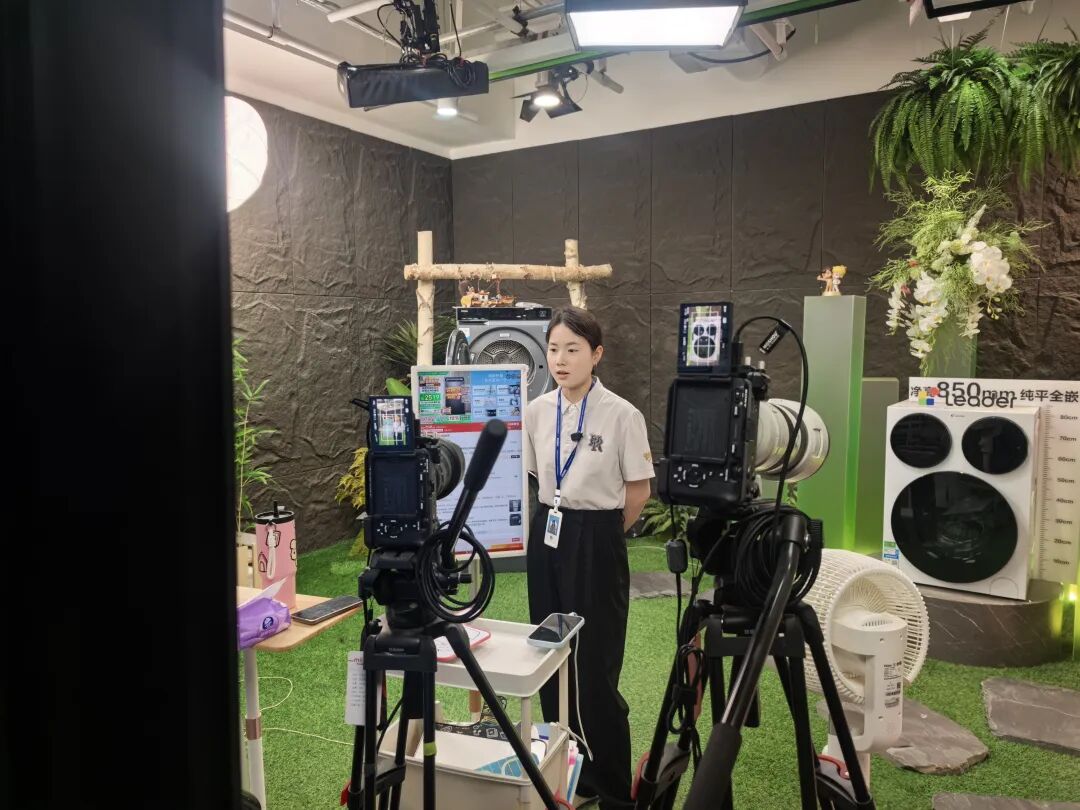 在绿幕直播间,设计师制作的三维场景可以实时抠像合成。画中画技术让冰箱保鲜、空调制冷等实验视频与主播讲解同屏呈现,一边播放测试画面,一边由主播解读。AI人脸识别追踪让摄像机自动跟随主播移动,无需人工跟拍。