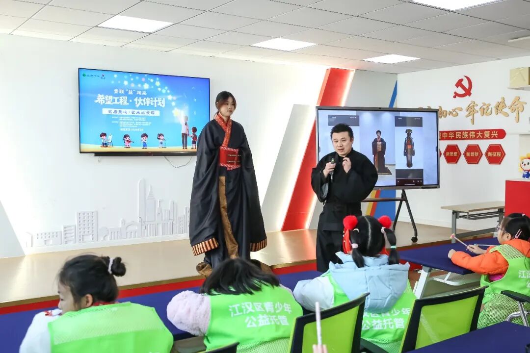 艺术成长课堂上,全国青联委员、湖北省青联常委陈超带领孩子们玩起了“你比划我猜”“故事接龙”等游戏,春节临近,她陪着小朋友比划起了“春联”“灯笼”“舞龙狮”等汉字词语,让大家感受传统春节习俗的同时,享受语言表达的乐趣。全国青联文化艺术界别副秘书长、湖北省青联委员刘正心则向孩子们讲解了中国传统服饰文化,并指导他们亲身体验汉服穿着,领略汉服之美。