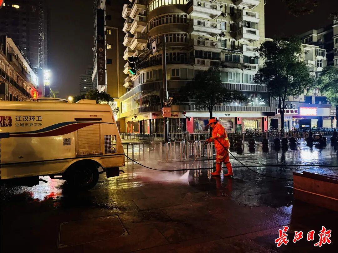 大年初一凌晨4时许,当整座城市还沉浸在年味酣眠中,江汉路步行街已迎来最早的一批劳动者。路灯下,数名环卫工人的橙色身影格外醒目,他们正逐段清扫、冲洗路面,为即将到来的春节客流提前擦亮城市窗口。
