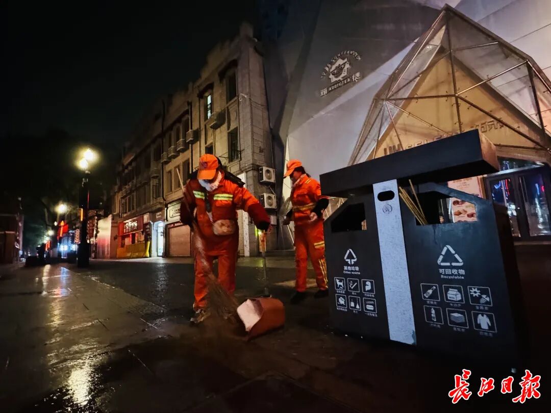 据武汉金融街集团江城天美保洁公司相关负责人介绍,春节期间,将根据江汉路的人流量,特别安排重点岗位突击人员。除夕至初一,环卫人员增加至20人,较平日增加了8至10名;初二至初七,环卫人员进一步增加至50人,较平日增加了30名。路面清洗工作也从原来的凌晨4时提前至深夜12时开始,所有的清洗油污工作将由专门的巡查班组负责,确保市民和游客每天都能看到一条干净整洁的江汉路。