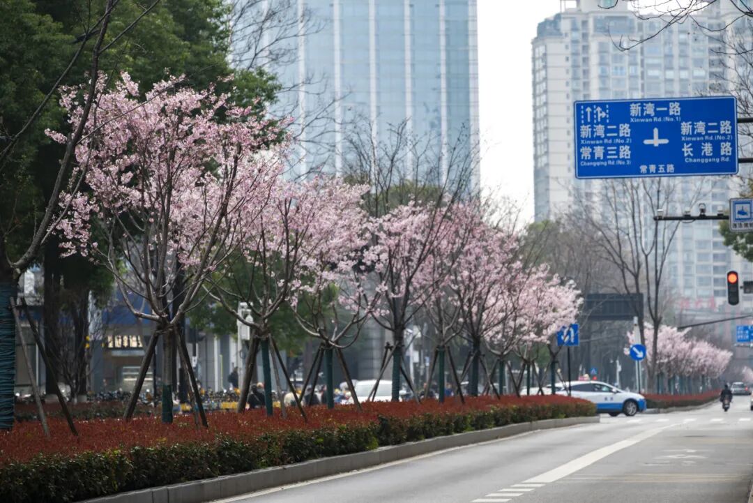 当别处的枝头尚且安静,常青五路的樱花已悄悄铺开,迎来最佳观赏期,长港路地铁口外,这条被樱花“点亮”的城市干道,成了附近居民“抬眼就见”的春日惊喜。
