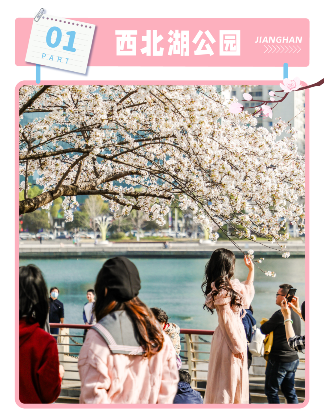 樱花盛开时,上百株樱花凭一己之力将西北湖装扮成温柔的湖畔,数百棵粉色花树沿着湖畔绽放,如烟如霞,浪漫的樱花层层叠叠,与湖水碧波交相辉映,传递着鲜活的自然讯息。