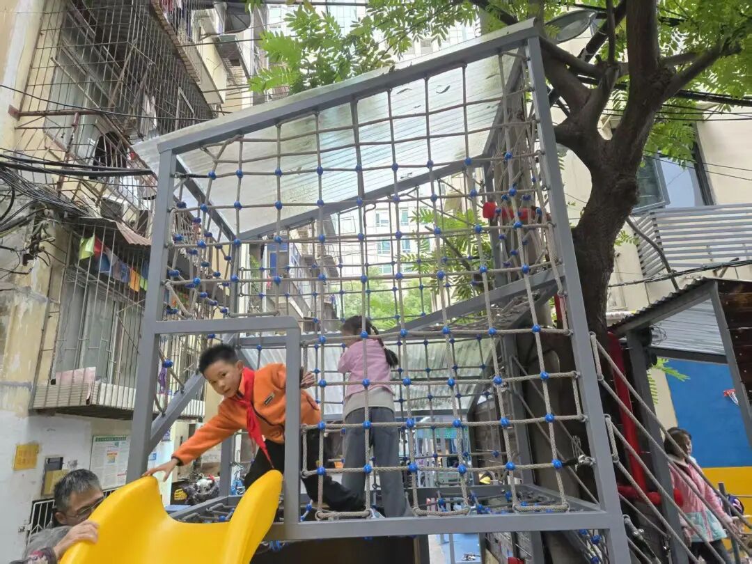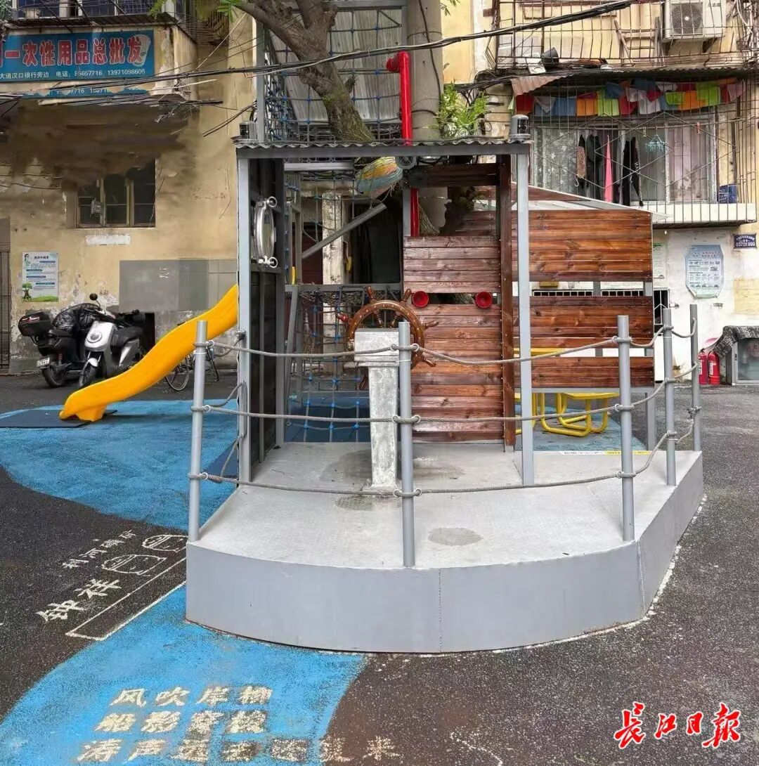 江汉区民权街道王家巷社区华航大楼主楼旁,一艘由废旧物料“手搓”而成的轮船造型游乐设施,成了孩子们的乐园。